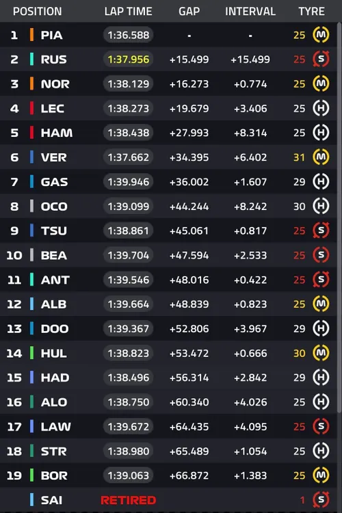 Sainz retired his car on lap 57 after suffering side damage and a ten-second penalty. Multiple penalties were handed out, including five- and ten-second penalties for Liam Lawson.