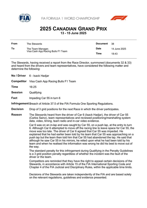 ''The Stewards heard from the driver of Car 6 (Isack Hadjar), the driver of Car 55 (Carlos Sainz), team representatives and reviewed positioning/marshalling system data, video, timing, team radio and in-car video evidence'', the official document states.