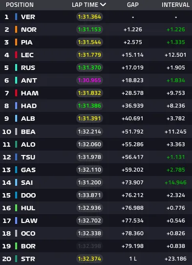 On lap 31 Verstappen caught up to Hamilton and overtook him on the exit on the triangle chicane. He then proceeded to hunt down Antonelli, who was still leading since the leaders made their first pitstop.