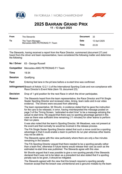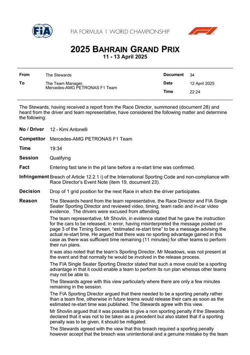 George Russell and Andrea Kimi Antonelli have both been relegated a single position by the stewards for failing to follow the race director's instructions. Before qualifying could resume, the two Mercedes drivers entered the fast lane before the restart time was confirmed.