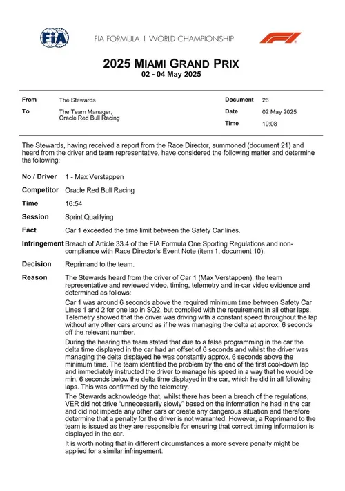 The stewards also underlined that "in different circumstances a more severe penalty might be applied for a similar infringement." See the full verdict below.