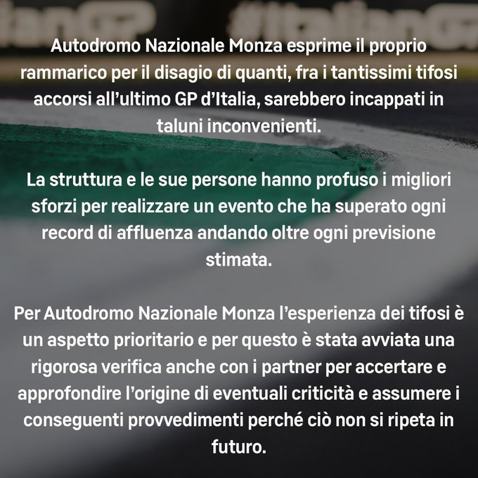 "Autodromo Nazionale Monza expresses its regret for the discomfort of those who, among the many fans who flocked to the last Italian GP, would have encountered certain in conveniences. The structure and its people have lavished their best efforts to realise an event that exceeded all attendance records, going beyond all estimated forecasts.""For Autodromo Nazionale Monza the fans' experience is a priority and for this reason a rigorous verification has been initiated also with the partners to ascertain and investigate the origin of any criticalities and take consequent measures so that this does not happen again in the future." Verstappen was interviewed after his victory in the Italian GP prior to the podium ceremony and Italian fans seized that moment to firmly boo the
