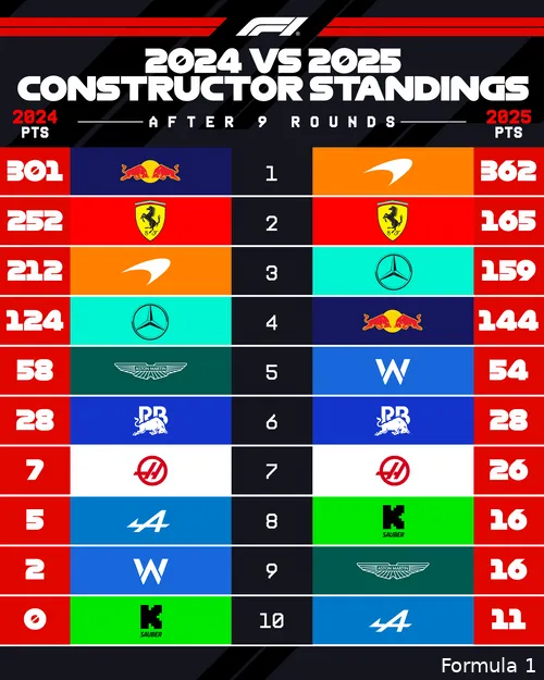 Remarkably, Racing Bulls are in sixth place, just like last year. However, the real surprise is Williams Racing's rise to fifth place.