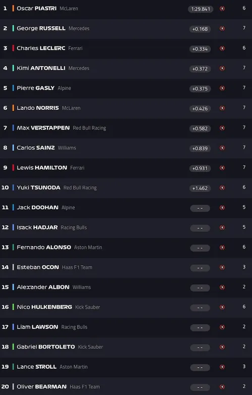 Oscar Piastri topped Qualifying at the Bahrain International Circuit. His fastest lap time was a 1:29.841. George Russell finished in P2 and will complete the front row of the grid, while Charles Leclerc rounded off the Top 3 this evening. Andrea Kimi Antonelli completes the second row of the grid.