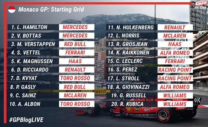 GPblog.com@GPblog_com·FollowSTARTING GRID: This is how the grid will line-up before today’s huge race! 🇲🇨 #F1 #MonacoGP #GPBlogLIVE 8:15 AM · May 26, 20190ReplyCopy linkRead more on X