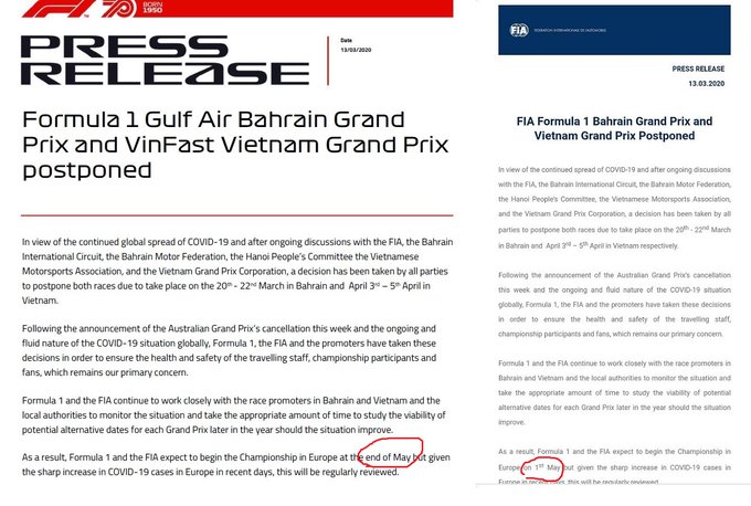 Formula 1 season. First, the Australian Grand Prix was postponed due to the coronavirus. This afternoon it was also announced that the Grands Prix in Bahrain and Vietnam have also been postponed to an as yet unknown date. In the statement of the FIA and the F1 different dates are mentioned about the beginning of the season.