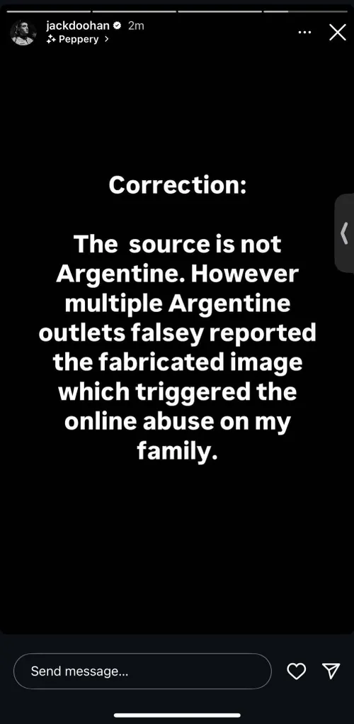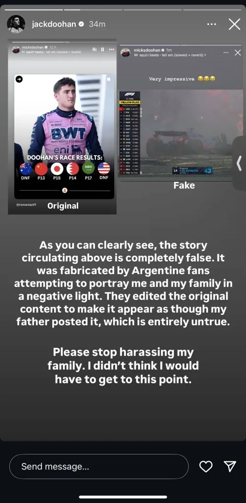 Doohan posted to his story: "As you can clearly see, the story circulating above is completely false. It was fabricated by Argentine fans attempting to portray me and my family in a negative light. They edited the original content to make it appear as though my father posted it, which is entirely untrue."