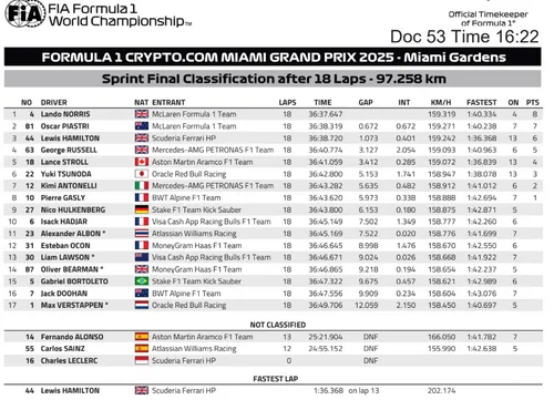 Lando Norris won the sprint race ahead of Oscar Piastri in P2 and Lewis Hamilton in P3. Max Verstappen finished out of the points after a 10-second time penalty. After the Sprint, stewards had a busy couple of hours. Three drivers who finished inside the points, Alexander Albon (Safety Car infringement), Liam Lawson (causing a collision) and Oliver Bearman (unsafe release) received five-second penalties.