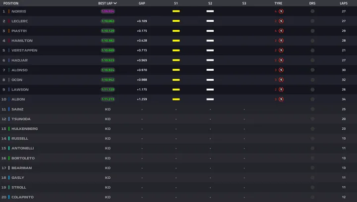 Isack Hadjar was the best of the rest in P6, ahead of Fernando Alonso and Esteban Ocon in P7 and P8, respectively, while Liam Lawson and Alex Albon rounded out the top ten.