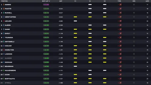 Gasly set a 1.29.239, with Norris just +0.007 behind. Charles Leclerc was also within a tenth, as foruth placed Oscar Piastri finished marginally over a tenth behind the top three in fourth placed. There were no notable incidents in the session. However, Ollie Bearman suffered a scary lockup in the first corner. The Brit grazed the wall, but continued.