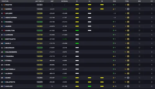 Four out of the 44 laps were done under the safety car before a rolling start brought the race to green flag conditions, with Norris leading Piastri and Leclerc down into turn 1.