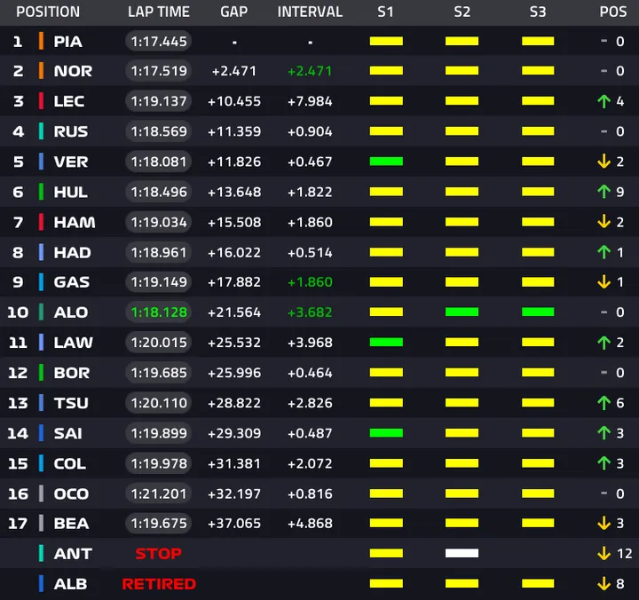 Behind the two McLarens, even with a set of hard tyres to end the race, Charles Leclerc rounded out the podium.