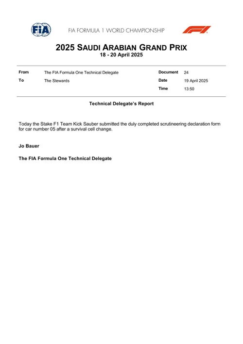 Gabriel Bortoleto's survival cell. The team have completed the 'scrutineering declaration form' for the FIA.