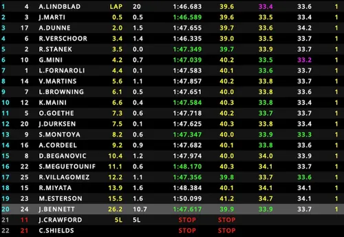 Robert Stanek finished in P5, ahead of Gabriele Mini, who had an eventful race, cutting the first turn on multiple occasions. Leonardo Fornaroli and Victor Martins finished in the final points-paying positions today.
