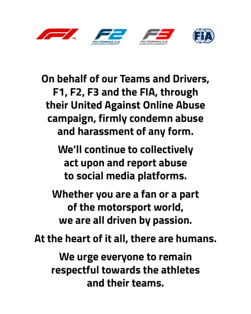 The statement reads: "On behalf of our Teams and Drivers, F1, F2, F3 and the FIA, through their United Against Online Abuse campaign, firmly condemn abuse and harassment of any form. We'll continue to collectively act upon and report abuse to social media platforms. Whether you are a fan or a part of the motorsport world, we are all driven by passion. At the heart of it all, there are humans. We urge everyone to remain respectful towards the athletes and their teams."
