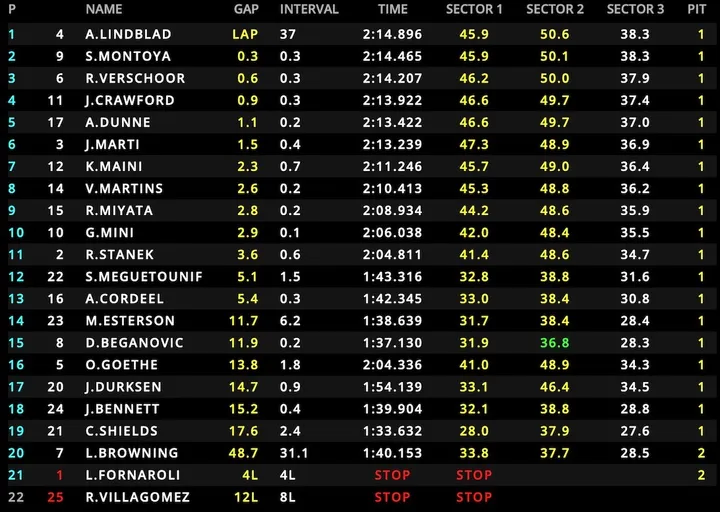 Prema Racing and Montoya reacted to Verschoor's stop a lap later, but on warmer tyres, the Dutchman could put the Colombian under pressure. Lindblad pitted on Lap 12, and the Briton returned to the track comfortably ahead of his rivals.