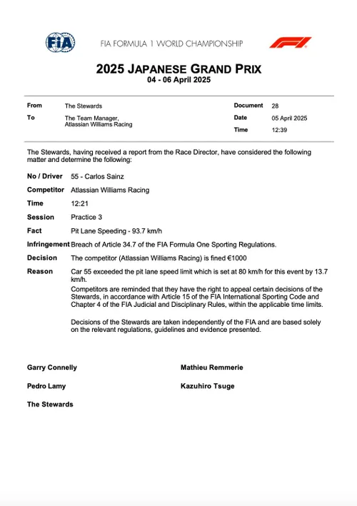 Sainz went over the 80 kph limit by 13.7 kph, and earned himself a fine of €1000 for breaching the sporting regulations.