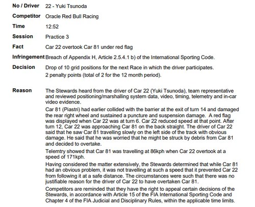 As a result, he receives a 10-place grid and two penalty points on his super license, similarly to the penalty Oliver Bearman received for the same incident at the Monaco GP.
