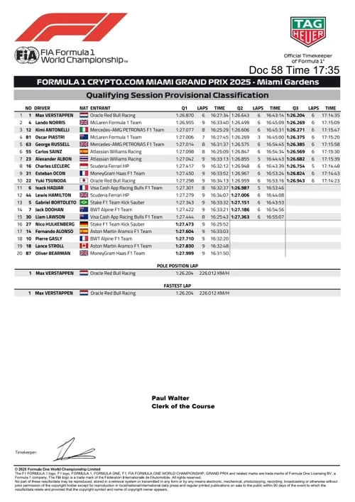 Max Verstappen who put his RB21 on top, ahead of Lando Norris in P2, and Andrea Kimi Antonelli in P3. Behind them, championship leader Oscar Piastri will start the race from P4.