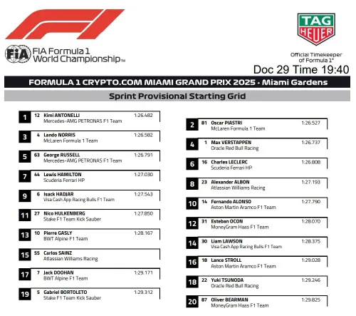 Andrea Kimi Antonelli will start the short race from pole position, with Both McLaren drivers, Oscar Piastri and Lando Norris behind him in P2 and P3, and Max Verstappen in P4. Here's the provisional starting grid for the sprint race in Miami. It was the first time Antonelli drove on the Hard Rock Stadium circuit, but it seemed as if he'd already been racing there for years. Where veteran teammate George Russell failed to settle in, Antonelli was feeling more and more comfortable with each lap, and on that final run in SQ3 the young Italian saw his opportunity and capitalised on it edging out both McLarens for pole.