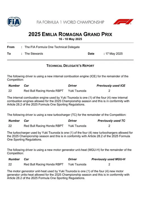 After the survival cell change - the central chassis component that protects the driver in severe crashes -, the team used several components of a different specification. As a result, Tsunoda will have to start from the pit lane, the FIA reports.