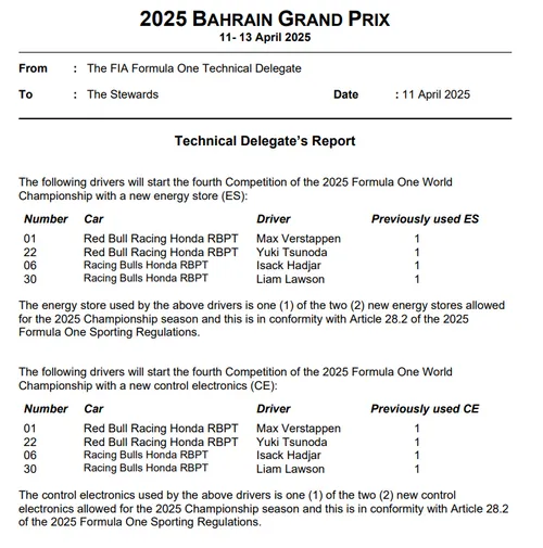 Both Red Bull Racing and Racing Bulls drivers have received a new power unit component for the Bahrain GP, the FIA shared in the document summarising the changes for the weekend. During the weekend in Sakhir, all drivers within the Red Bull family will receive a new energy story (ES) and a new control electronics (CE) component as well.