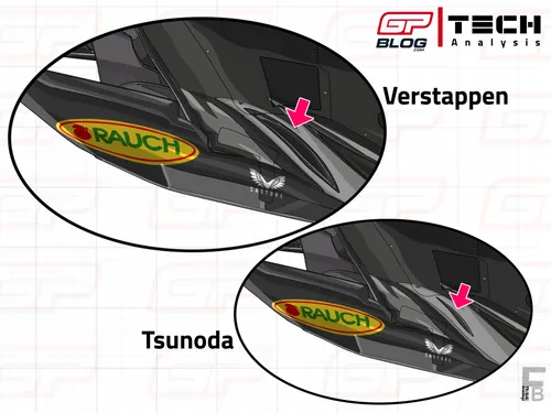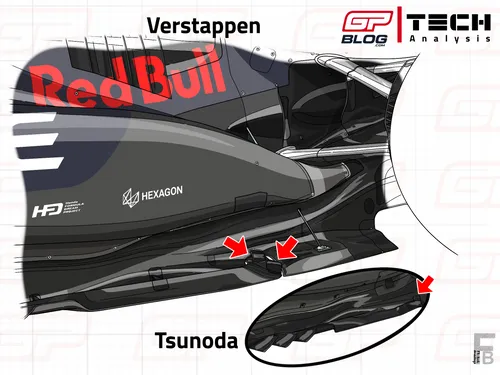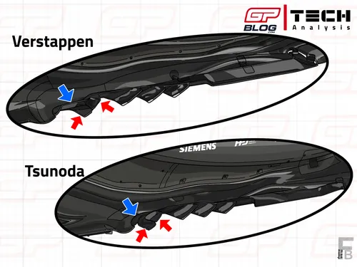 For what concerns the floor edge wing, it has been completely re-profiled to work in synergy with the front floor changes: as shown in the drawing below, the new floor edge (the one adopted by Verstappen) is longer than the previous version (used by Tsunoda), due to the addition of some winglets at the front.