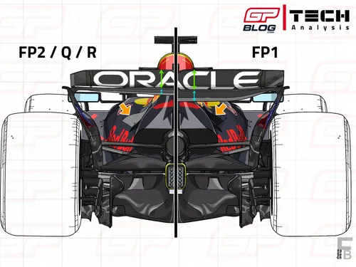 As highlighted in the drawing below, the new rear wing was characterised by a much shorter chord of both the DRS flap (green arrow) and of the mainplane (blue arrow), which also featured a flat mainplane to reduce drag as much as possible. Moreover, from FP2 onwards the team also ran a much closer car (orange arrow), due to the low temperature, thus reducing the vents on the side of the engine cover designed to dissipate heat.