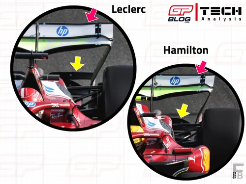 As highlighted in the picture blow, Leclerc adopted a medium downforce rear wing (same spec of Hamilton) but with the DRS flap slightly trimmed, to reduce the drag generated and thus improve the top speed on the straights (pink arrow).