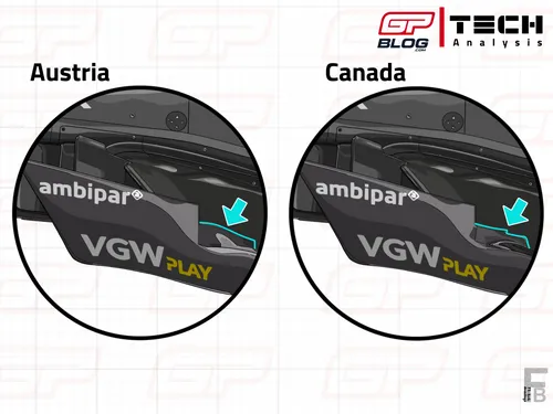 The main goal of this design is to generate a higher pressure area at that front section of the floor with the new floor fences, in order to push the front tyre turbulence towards the outside, preventing it from being sucked under the floor. At the same time, the new outer floor fence connection helps producing a vortex to keep the flow attached in that area.