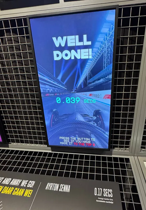 Om het geheel niet heel deprimerend af te sluiten, ook nog een wat vrolijkere highlight van de tentoonstelling. Stiekem vond ik het reactiespel toch wel een van de leukste delen van de hele tentoonstelling. Tegen het einde van de persronden stond mijn tijd bovenaan de ranglijst. Ik wist na een aantal pogingen binnen 0.039 seconden op de knop te drukken, waarmee mijn reactietijd vier keer zo snel was dan de gemiddelde reactietijd van Ayrton Senna en Max Verstappen. Een mooie statistiek voor op mijn CV, al gok ik dat dat meer door geluk dan wijsheid kwam.