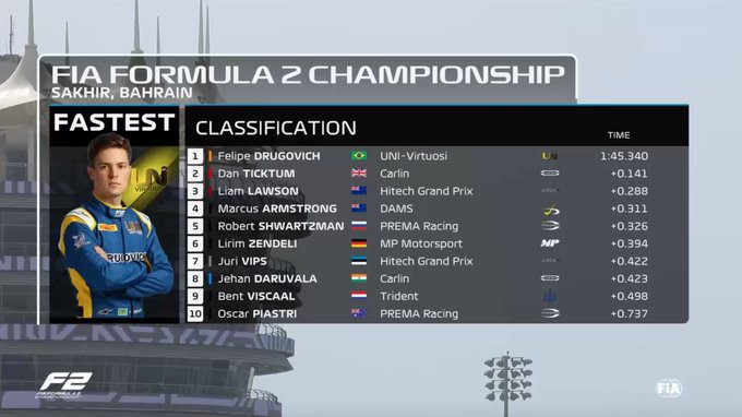 De snelste man van de sessie was Felipe Drugovich. De Braziliaan zette een tijd van 1:45,340 neer. Daarmee liet hij Dan Ticktum en