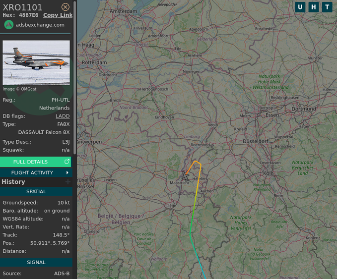 Een klein uur nadat de radar op dinsdagochtend aangaf dat de privéjet van Verstappen in Nederland aangekomen was, bleek uit de gegevens dat het toestel alweer was vertrokken vanuit Limburg.