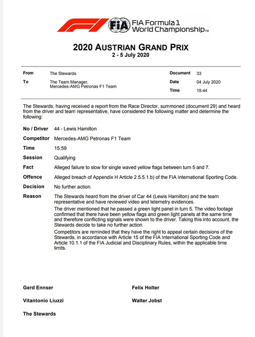 Lewis Hamilton gaat vrijuit nadat hij voor twee verschillende zaken bij de wedstrijdleiding werd geroepen. Zo zou hij gele vlaggen genegeerd hebben, maar krijgt hier geen straf voor omdat tegelijkertijd een groen paneel getoond werd. Zijn eerdere snelle ronde wordt wel afgepakt, maar dat heeft geen gevolgen voor zijn startpositie.
