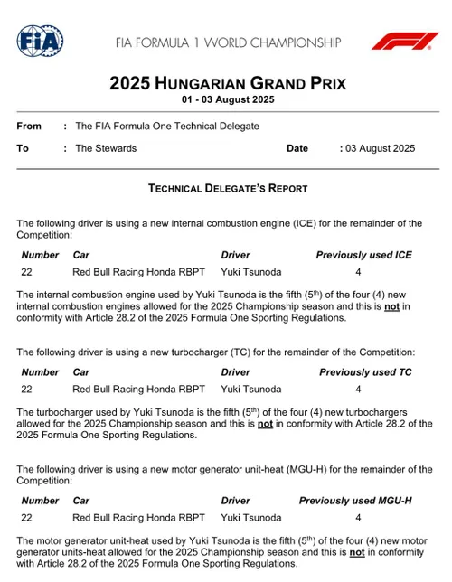 Na afloop van de kwalificatie voor de Grand Prix van Hongarije heeft Red Bull Racing nog gesleuteld aan de wagen van Yuki Tsunoda. Dit betekent een verandering aan de startopstelling voor de Grand Prix van Hongarije. Red Bull Racing heeft buiten de regels van parc fermé na de kwalificatie nog aan de wagen van Yuki Tsunoda gewerkt. Hoewel de officiële beslissing van de stewards in Hongarije nog moet vallen, betekent dit hoe dan ook een start vanuit de pitstraat.