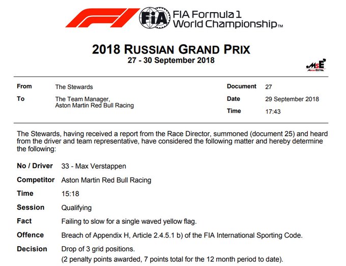 Stewards: Verstappen receives a 3-place grid penalty for ignoring yellow flags, plus 2 penalty points on this Super License. Up to 7 for the 12-month period #F1 #RussianGP