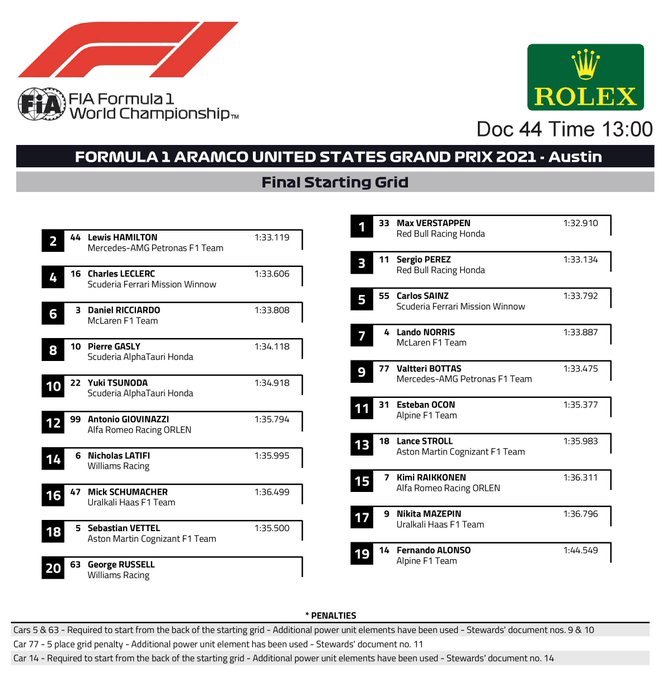 Er zijn weer een handvol aan gridstraffen dit weekend, wat leidt tot veel verschuivingen in de definitieve startgrid van de Grand Prix van de Verenigde Staten.