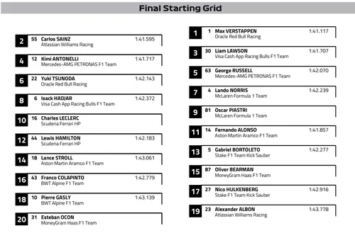 Carlos Sainz start naast de Nederlander vanaf de tweede plaats. Er werden weinig wijzigingen doorgevoerd na de uitslag van de kwalificatie: alleen Esteban Ocon werd naar achteren geplaatst na een diskwalificatie.