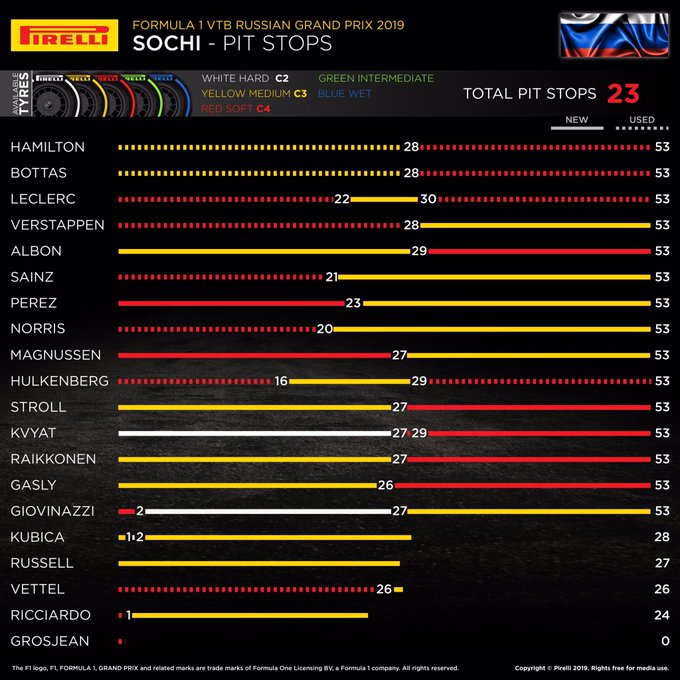 Pirelli heeft de gekozen banden strategieën gedeeld bij de Grand Prix van Rusland. De safety car-onderbrekingen gaven enerzijds wat speling op Sochi, maar boden in eerste instantie Mercedes eveneens de kans om de race naar hun hand te zetten.