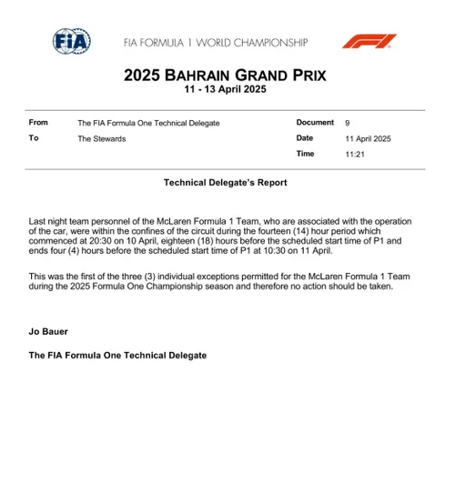 Voor de monteurs van McLaren was het een korte avond en nacht. Het Britse team was namelijk donderdag nog aan de slag, op het moment dat eigenlijk de avondklok van kracht was. Inmiddels is duidelijk dat McLaren geen straf krijgt opgelegd voor het werken na sluitingstijd. Jo Bauer, van de technische delegatie van de FIA, heeft in een kort document laten weten dat McLaren de eerste van de zogenaamde drie jokers in het seizoen 2025 heeft gebruikt. Bij een vierde keer of meer dat de avondklok niet wordt gehonoreerd, kan er wel een sanctie worden opgelegd.
