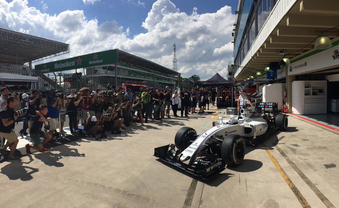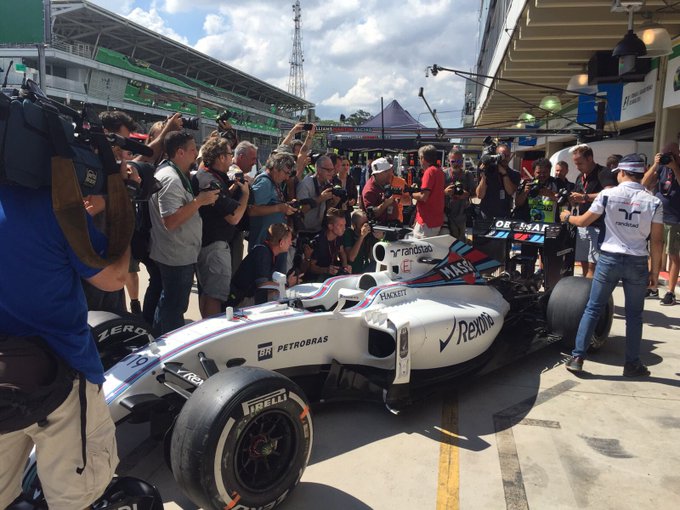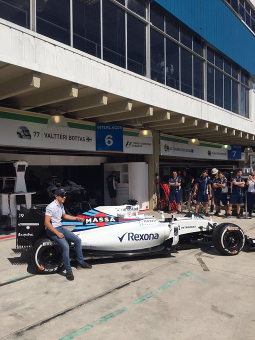 .@MassaFelipe19 checking out his special #BrazilGP livery courtesy of @Martini_drinks #ObrigadoMassa #WeAreRacing