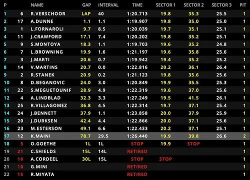 De Nederlander meldde al via de boordradio dat hij zich meer zorgen maakte om Dunne dan om Victor Martins, maar zijn pace was goed genoeg om het McLaren-talent achter zich te houden. Hiermee pakte hij ook een voorsprong in het kampioenschap, aangezien hij nu 7 punten voor staat op Dunne in het rijdersklassement, nadat hij gisteren Dunne tot één punt was genaderd.