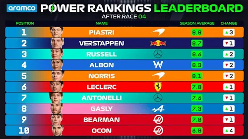 prestatie in de Power Rankings van Formula 1, is er na de Grand Prix van