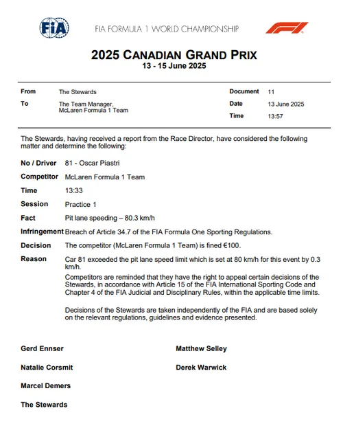de eerste oefensessie van het weekend. McLaren-coureur Piastri reed te snel in de pitstraat, zo was