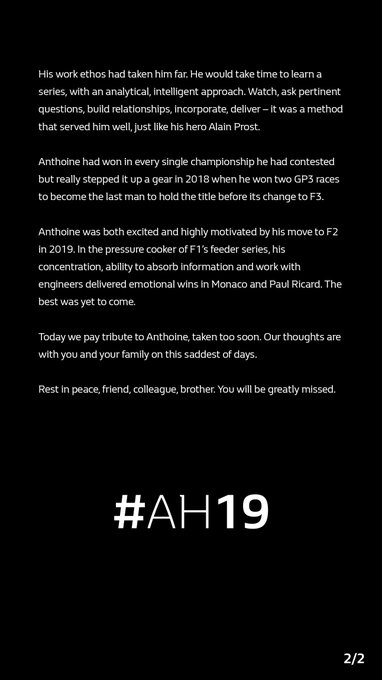 Als onderdeel van het talentenprogramma van Renault maakte de BWT Arden-coureur zijn debuut in een F1 wagen tijdens een showrun en een privé testdag. Hubert was met twee overwinningen als F2-rookie een coureur met potentie. Het Renault-team heeft haar medeleven gedeeld en draagt een mooie tekst op aan de overleden Fransman: