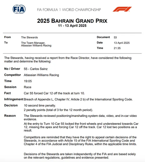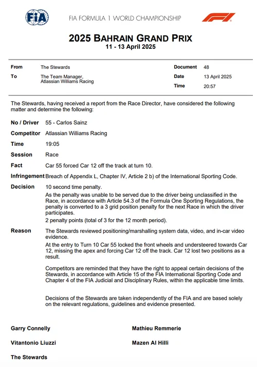 Tijdens de Grand Prix van Bahrein heeft Carlos Sainz Andrea Kimi Antonelli van de baan geduwd waardoor de Italiaan twee plekken verloor. De Spanjaard kreeg hiervoor een tijdstraf, maar deze heeft hij niet uitgezeten tijdens de wedstrijd. Hierdoor krijgt Sainz een nieuwe straf. Tijdens de Grand Prix van Japan kreeg Carlos Sainz al twee straffen van de FIA. Eerst kreeg de Spanjaard een gridstraf van drie plekken voor het ophouden van Lewis Hamilton in de kwalificatie.