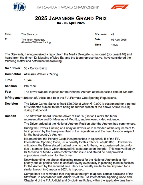 Na afloop van de Formule 1-race hebben de stewards gekeken naar een moment van voorafgaand aan de race. Sainz was namelijk te laat voor het Japanse volkslied. Dit is voor de FIA een belangrijk moment om respect te tonen voor het land waarin de Grand Prix plaatsvindt.