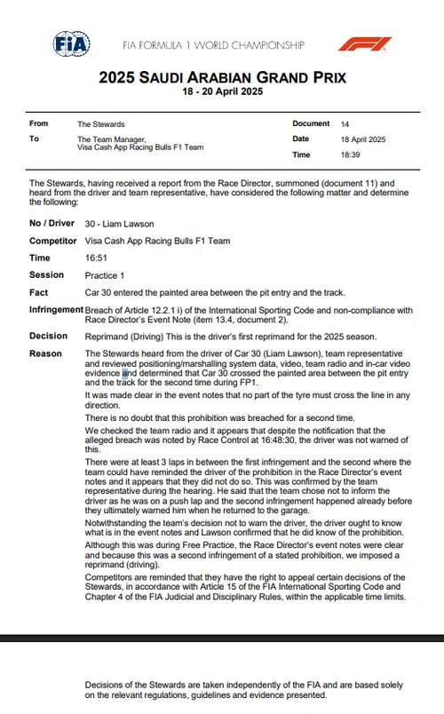‘Event Notes’ van de racedirecteur in Jeddah. Lawson hield zich tot tweemaal