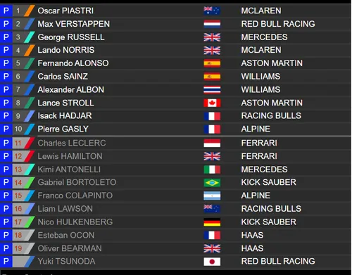 Na een ongelooflijk spannende kwalificatie, vol chaos, heeft Oscar Piastri pole bemachtigd, vlak voor Max Verstappen op P2. De Nederlander zat er slechts drie honderdsten achter. Een eervolle vermelding voor George Russell, die op de mediumbanden de derde plaats kon bemachtigen. In de eerste run stond Verstappen nog op P1, maar Piastri wist in de tweede ronde van Q3 er nét onder te duiken.