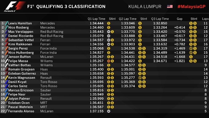 Formula 1@F1·FollowPROVISIONAL CLASSIFICATION (END OF QUALI) Stunning effort from @LewisHamilton #MalaysiaGP 🇲🇾 #F1 10:11 AM · Oct 1, 2016722ReplyCopy linkRead 16 replies